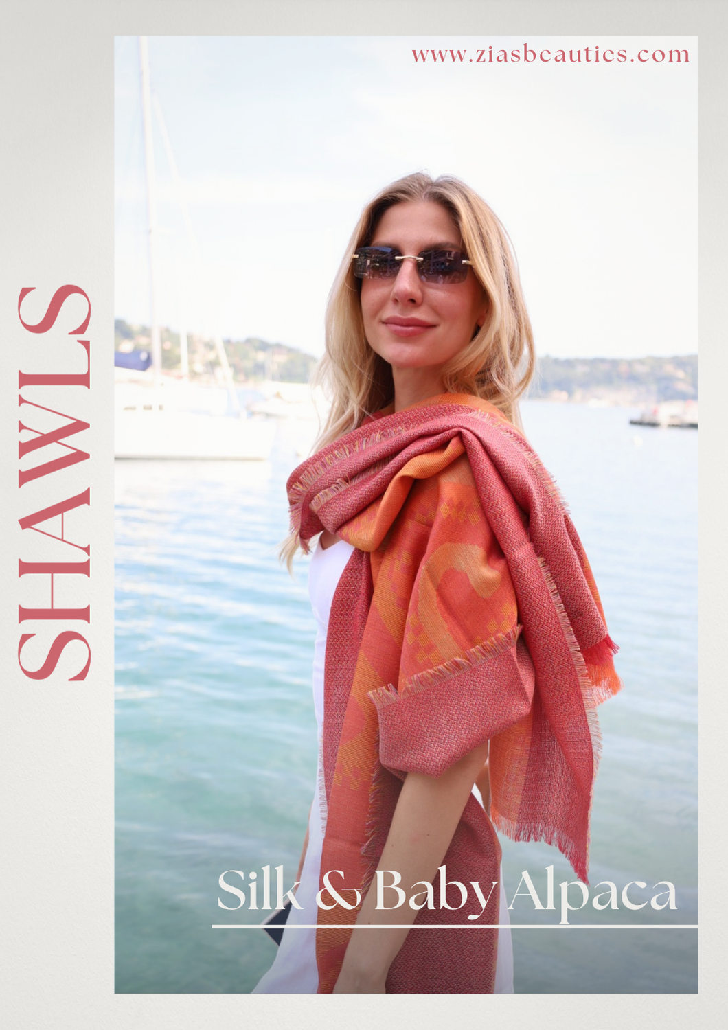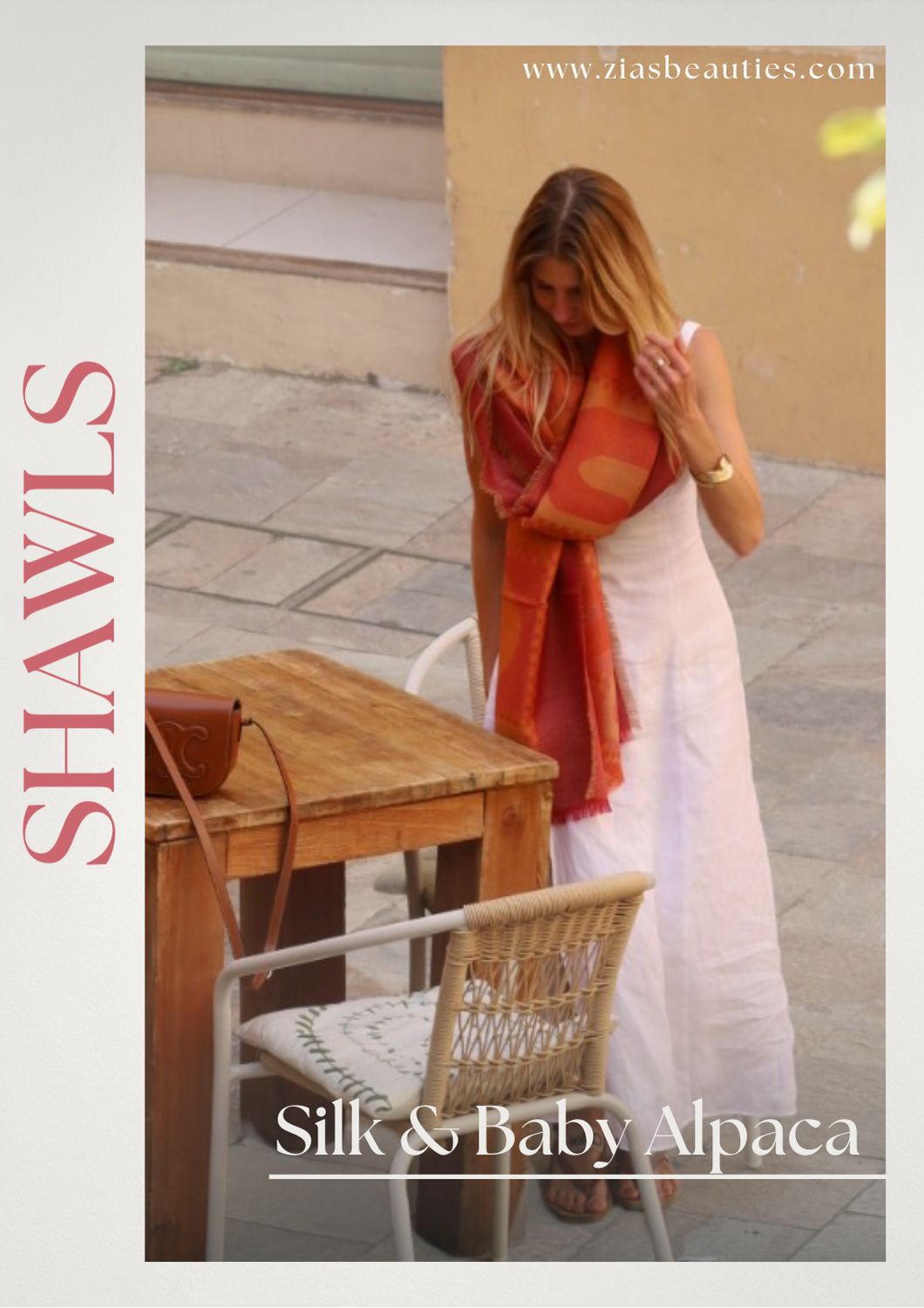 Indulge in a sensation of luxury and softness with our Baby Alpaca and silk Peruvian shawl.