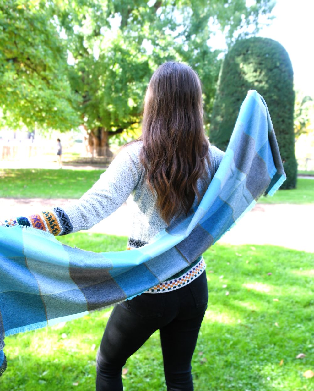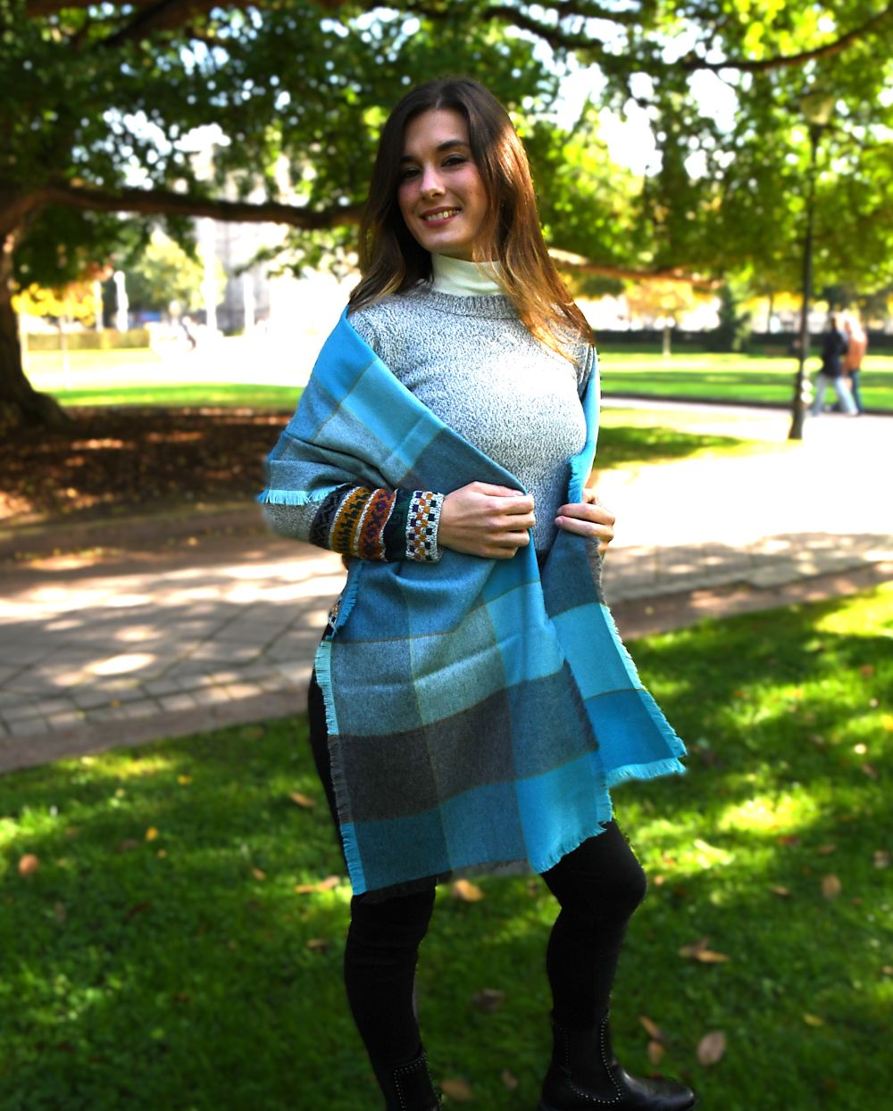 • This reversible blue and gray check-pattern scarf is woven from 100% Baby Alpaca wool, offering an exceptional combination of warmth, softness, and durability.