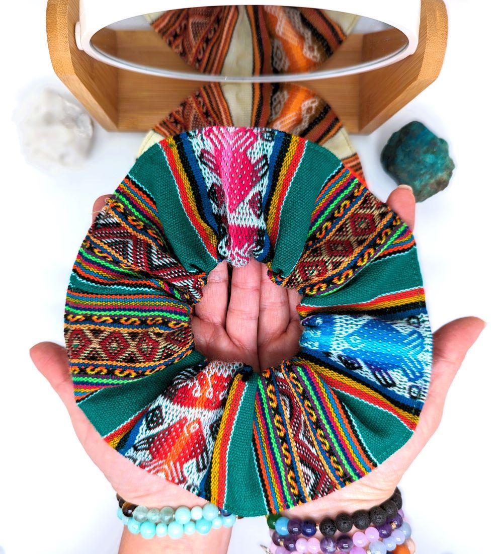 Embrace the spirit of wanderlust and individuality with our eye-catching Peruvian Fabric Hair Scrunchie.