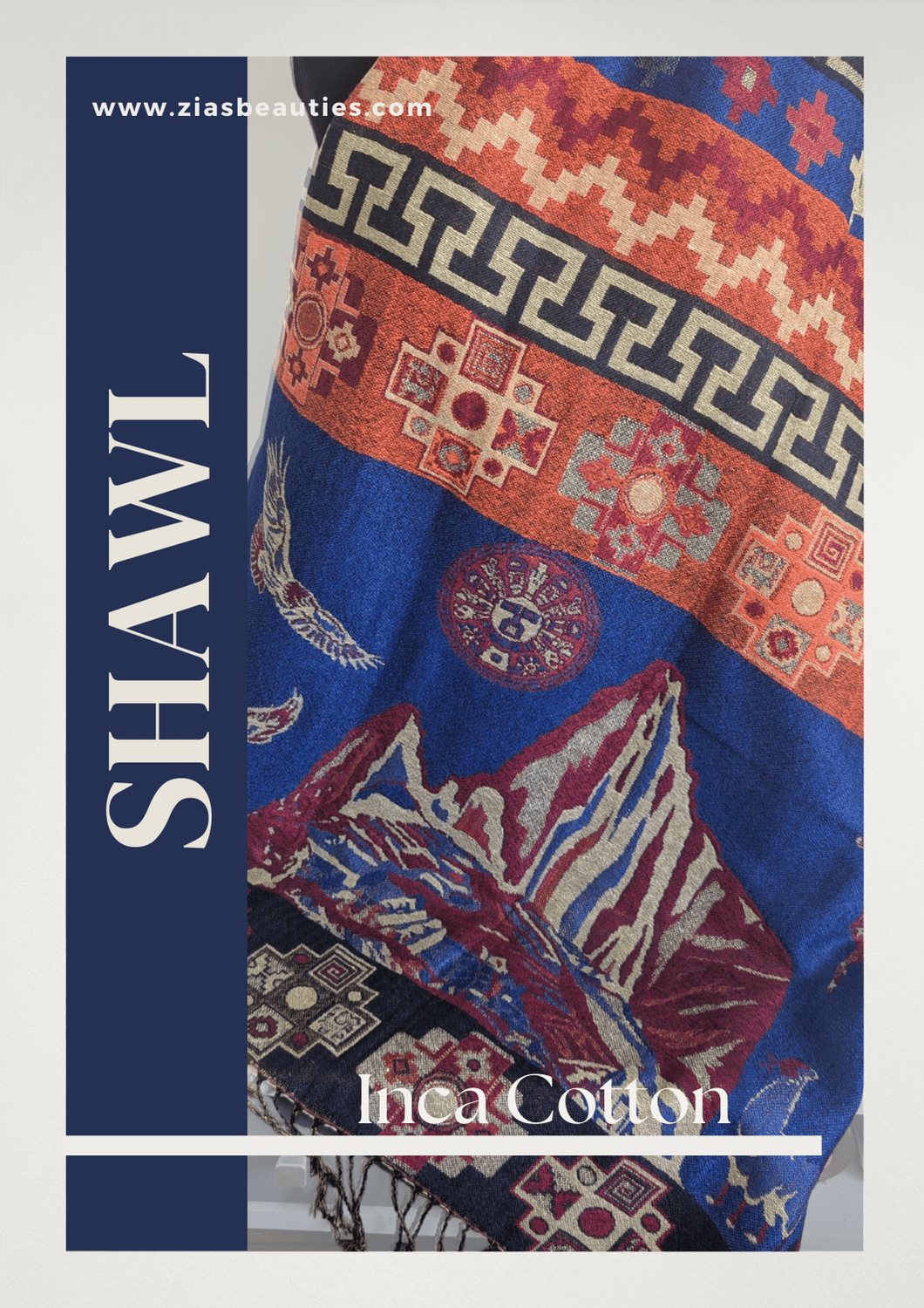 This 100% Peruvian cotton shawl is meticulously woven on a traditional wooden loom by skilled artisans, ensuring an authentic and high-quality textile. Featuring intricate Andean and Inca geometric patterns, this reversible shawl offers versatility and sophistication, adapting seamlessly to both winter and summer wear.